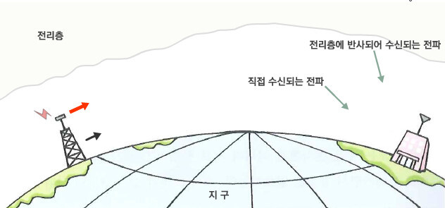 - 지구의 구면을 따라 직진하는 전파와 전리층과 지표 사이를 반새해가며 반대편까지 도달하는 전파