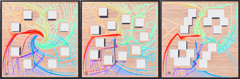 Map의 크기는 2 x 2 [m]이고, 목적지는 (0,0)인 중심이다. 가로가 1.8 [m]인 정사각형 테두리를 1000개의 점으로 균등하게 나누고, 각 점에서 출발하여 목적지까지 도달하는 테스트이다. Test 환경은 easy, normal, hard 로 Easy 는 장애물의 개수 8개로 30cm떨어진 거리로 이루어진다. Normal 은 13cm 떨어진 거리로 배치되며, 장애물의 개수는 12개이다. Hard는 장애물의 개수 16개로local minima [LM]를 직면하는 환경이다