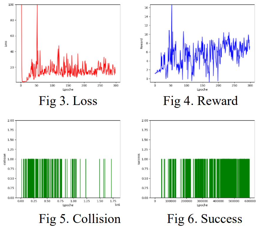 손실 값은 수렴하고, 누적 보상은 증가한다. 훈련 환경에서 에이전트가 훈련 될수록 충돌은 줄어들고 목적지에 도달하는 성공 횟수는 높아지는 것을 볼 수 있다.