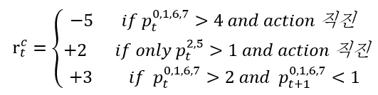 Reward 구조는 목적지 관련 보상 과 충돌 회피 관련 보상 으로 나뉜다.